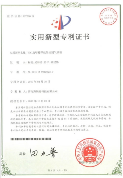 - VOC及甲醛釋放量檢測(cè)氣候箱專利證書