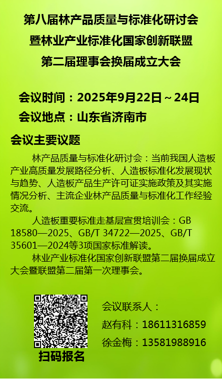 金秋送爽,泉韻悠揚。“第八屆林產品質量與標準化研討會暨林業產業標準化國家創新聯盟第二屆理事會換屆成立大會”將于2025年9月22日~24日在山東濟南舉辦。